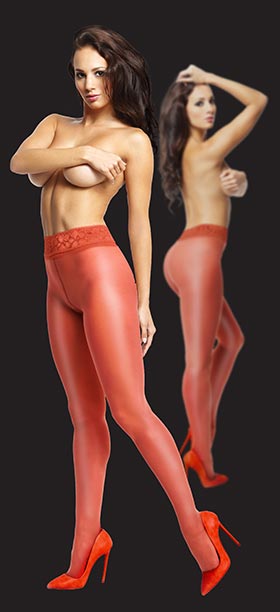 P105 szexi 20 DEN 80% poliamid, 20% elasztán női harisnya – enyhén csípő fazon, a szilikon csíkos csipkés gumi tartja a kényelmesebb viselés miatt. Bársonyos tapintású, kivételesen fénylő. Enyhén elvégzett, kb. 15 cm átmérőjű intim kivágással.